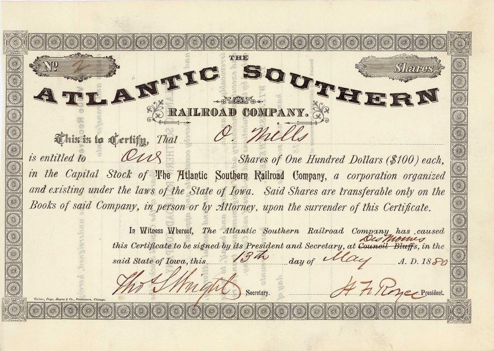 Fondata nel 1879 per costruire l’Atlantico-Griswold, Ia, lungo 14 miglia ed entrato in funzione nel 1879/80. Già nel 1880 si unì a Chicago, Rock Island e Pacific.