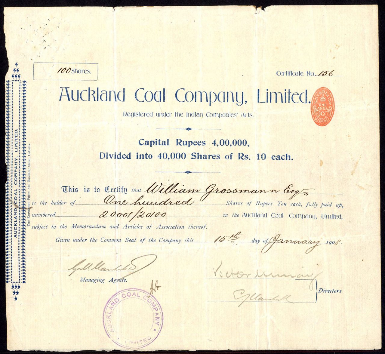 Incorporato sotto gli Indian Companies Acts. Capitale 4.000.000 di rupie in azioni di 10 rupie