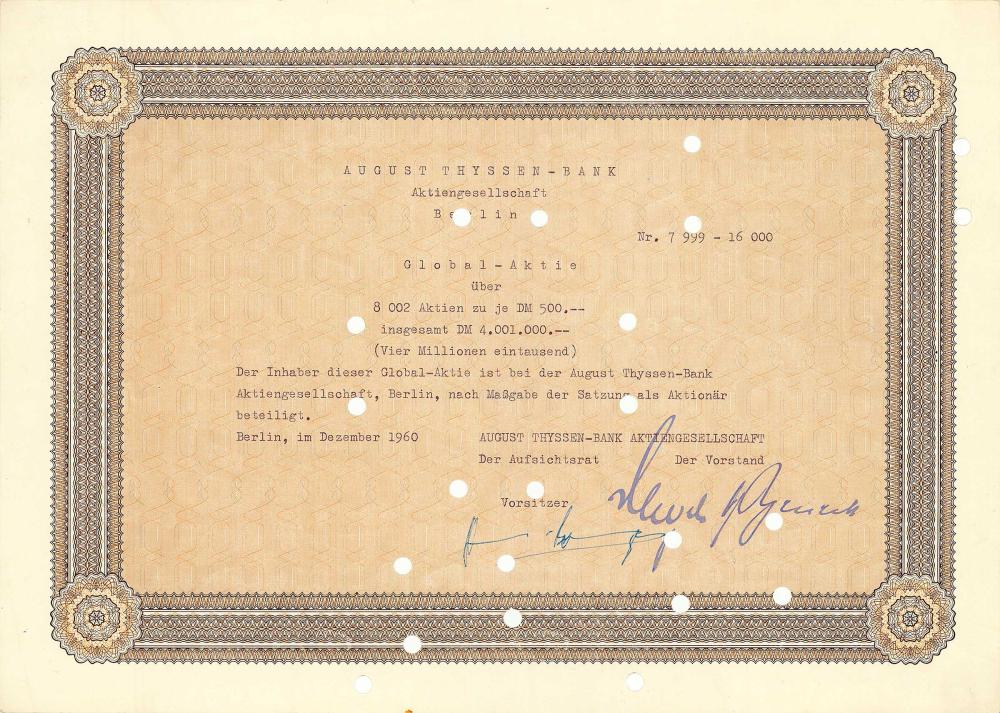 La August Thyssen Bank era una banca che visse dal 1930 al 1961. Le sue sedi erano ad Amsterdam e Düsseldorf. Prima del 9 novembre 1918, August Thyssen fondò la Bank voor Handel en Scheepvart N.V. a Rotterdam. Thyssen disponeva di una rete mondiale di fornitori di servizi finanziari che consentiva il trasferimento di capitali in tutto il mondo. Nordstern-Bank AG, fondata nel 1923, operava come la Banca Von der Heydt di Amsterdam e fu rilevata dalla famiglia Thyssen nel 1927. Dal 1930 fu ribattezzato August-Thyssen-Bank e proprietario di Bank voor Handel en Scheepvaart N.V. Dopo l’8 maggio 1945 la banca aveva sede legale a Düsseldorf. La società è stata inclusa nella rendicontazione nel processo di Thyssen Bank.