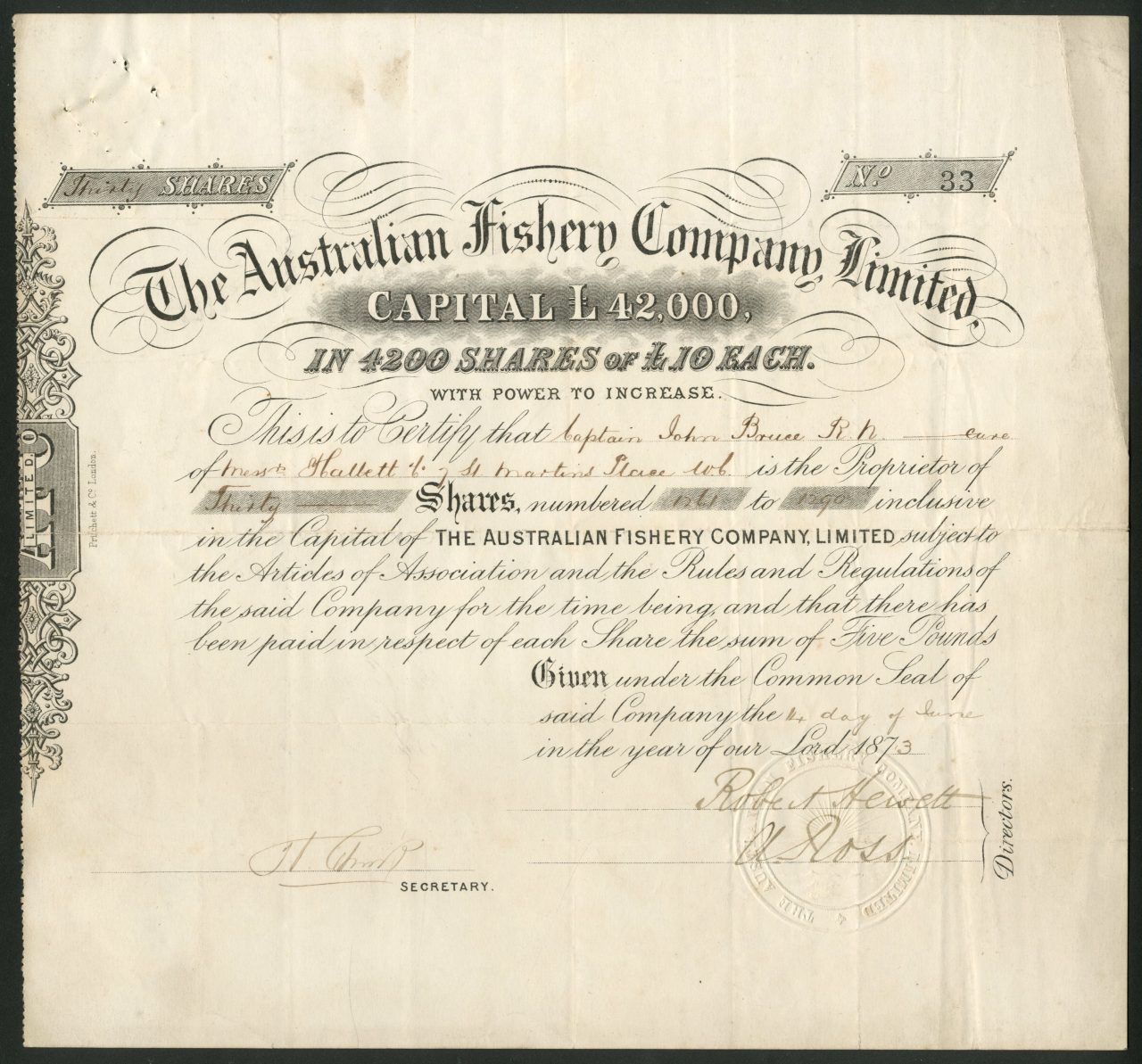 Registrato nel 1873. Dissolto <1916. Azienda numero 7027. Formata per la pesca delle perle al largo della costa nord occidentale dell’Australia occidentale. L’avventura non ebbe successo, uno dei suoi yacht “Incantatrice” andò perso e l’altro “Fiore di Achillea” fu venduto.