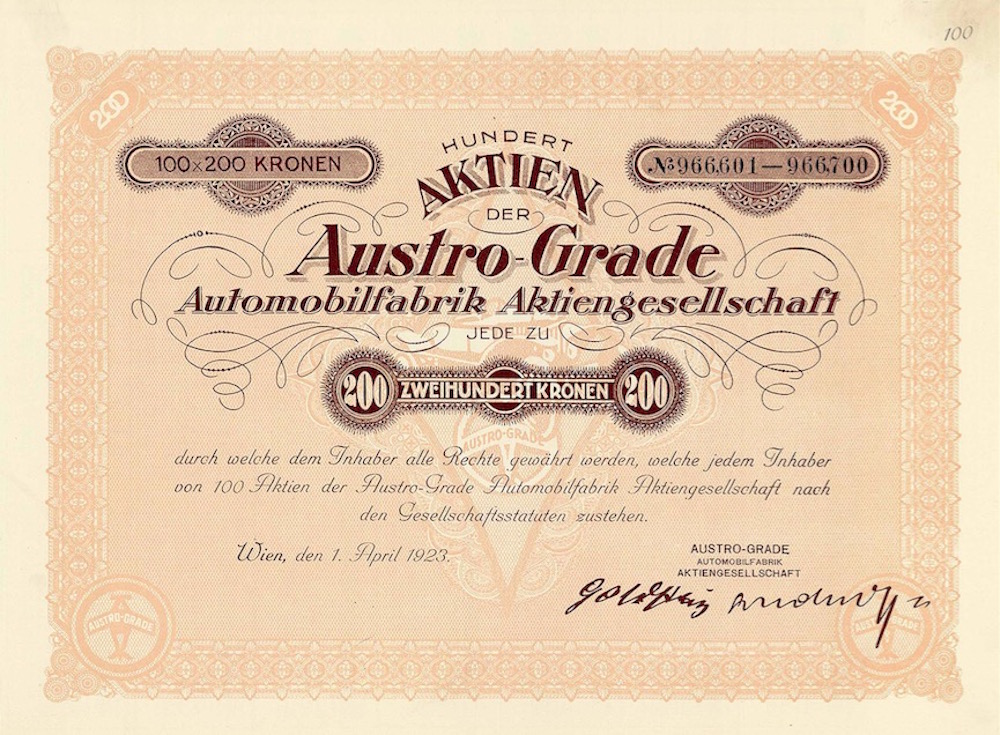Fondata nel 1922. Un anno dopo il tedesco Hans Grade, originariamente un pioniere dell’aviazione, fondò la sua prima fabbrica di automobili a Berlino. Grazie alle sue radici nell’aviazione, le sue carrozzerie avevano elementi della costruzione di aerei, ma l’auto ha mostrato anche la pressione negativa di questa quota. La filiale austriaca rilevò i lavori industriali statali Klosterneuburg insieme al parco macchine dall’amministrazione federale e acquisì anche tutte le quote della A-B-C Karkörpergesellschaft mbH a Liesing. Il 28 giugno 1926, la liquidazione fu decisa dopo che la società madre tedesca di Hans Grade ebbe difficoltà già nel 1924.