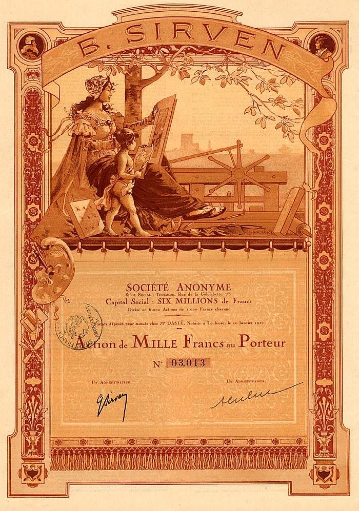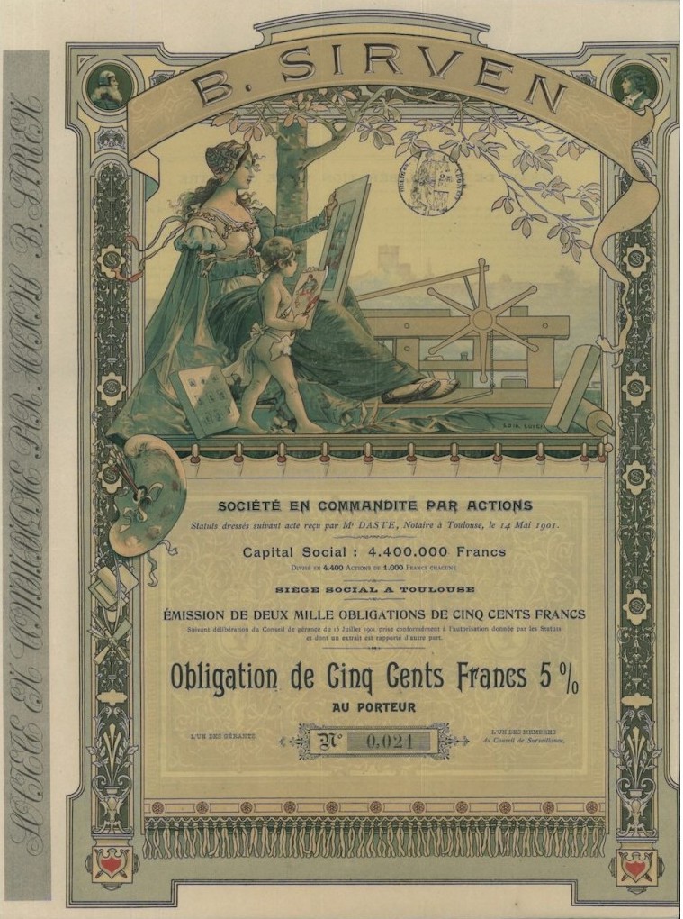 Splendida grafica a cura del famoso pittore francese Luigi Loir (1845 - 1916, firma sul fronte in basso a destra) noto per le sue litografie con vedute di Parigi. Agli angoli superiori piccoli medaglioni con ritratti di Gutenberg, ideatore della stampa a caratteri mobili e del poeta boemo Senefelder che, nel 1796, inventò casualmente la litografia. La Sirven, famosa stamperia d'arte nota soprattutto fra i collezionisti di stampe litografiche, possedeva anche una cartiera, una legatoria e produceva articoli di cartoleria e per ufficio.