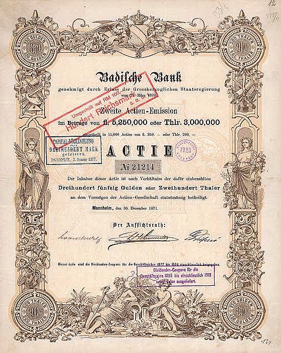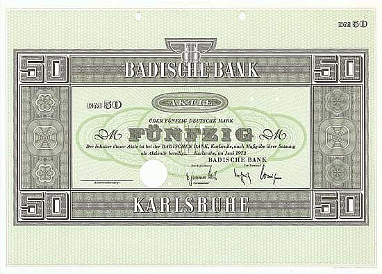 Originariamente costruita nel 1870 come Badische Bank a Mannheim, una banca privata con privilegio di banca centrale (che fu revocata solo nel 1931). Banca fidata dello stato di Baden dal 1923, che divenne anche azionista di maggioranza nel 1931 rilevando un blocco più ampio di azioni precedentemente detenute da Deutsche Bank. Nel 1932 trasferimento a Karlsruhe, altre filiali esistevano a Friburgo i.B. (dal 1937, ex attività bancaria Carl Trautwein), Pforzheim (dal 1935/36, ex casa bancaria Carl Schmitt & Cie. e l'associazione bancaria Pforzheim) e temporaneamente Strasburgo (Alsazia), nel 1977 si fonde con la Württembergische Bank (ex: Württ. Notenbank) e la Handelsbank Heilbronn AG per formare la Baden-Württembergische Bank AG. Su iniziativa del govern... Altro