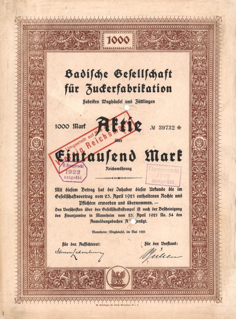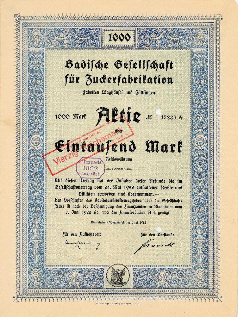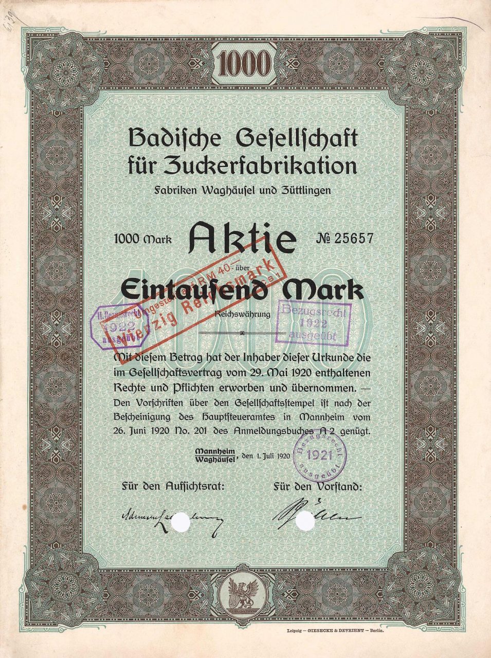 Fondata nel 1836. A Waghäusel (Baden) erano presenti una fabbrica di zucchero greggio, una raffineria di zucchero e un'ulteriore fabbrica di zucchero greggio a Züttllingen vicino a Heilbronn (Württ.). Entrambe le fabbriche si sono espanse su 6.500 ettari di terreni in affitto, anche con barbabietole da zucchero. Nel 1918 acquisizione della quota di maggioranza della Zuckerfabrik Rheingau AG a Worms. Nel 1923, allo stato di Baden fu assegnato un pacchetto azionario più ampio a un prezzo preferenziale per rafforzare le relazioni con l'amministrazione del dominio Baden (noleggio di ampie aree per la coltivazione della barbabietola). Quotata alla Borsa di Francoforte e Mannheim, anche a Berlino dalla fine del 1923. Nel 1926 fusione con Frankenthal, Stoccarda, He... Altro