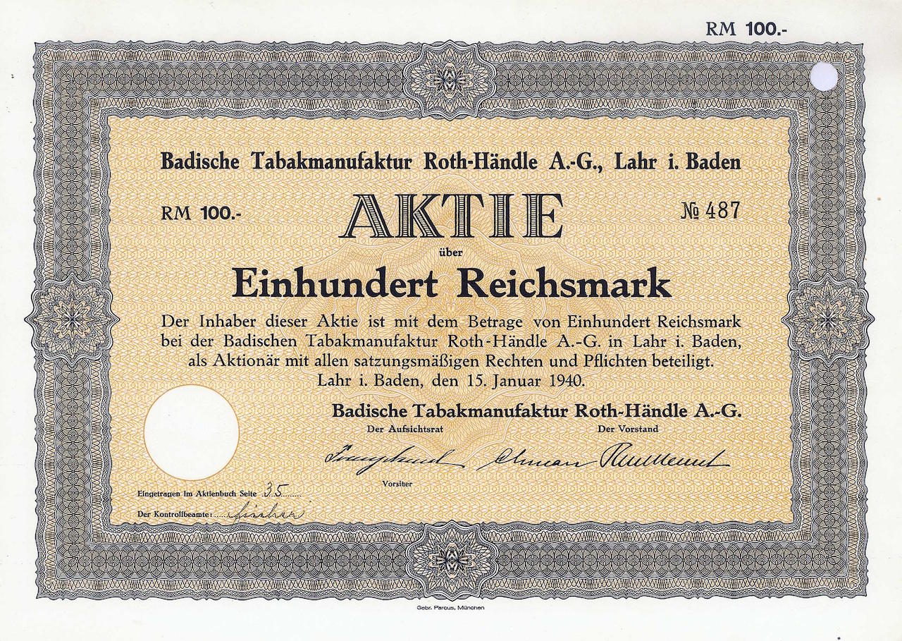 Fondata nel 1890 come Elsässische Tabakmanufaktur AG a Strasburgo nell’I.E., derivante dalla fabbrica di tabacco di lunga data di J. Schaller & Bergmann a Strasburgo-Neudorf. Poco dopo la fine del secolo, ebbe diverse partecipazioni in altre fabbriche di tabacco a Hanau, Bingen, Berlino e Dresda. Nel 1919 la fabbrica di Strasburgo fu confiscata dai francesi. I principali azionisti hanno risposto trasferendo la produzione alla Badische Tabakmanufaktur Roth-Händle GmbH, fondata nel 1920 a Francoforte sul Meno. Questa società fu convertita in AG nel 1922 e nel 1928 si trasferì a Lahr nella Foresta Nera. Nel 1942, entrambe le compagnie, che erano praticamente una di fronte all’altra su entrambe le sponde del Reno, furono nuovamente fuse per un breve periodo. I marchi più noti sono Roth-Händle e Reval dalla metà degli anni ’30. Oggi vive come GmbH ed è una filiale al 100% di Reemtsma.