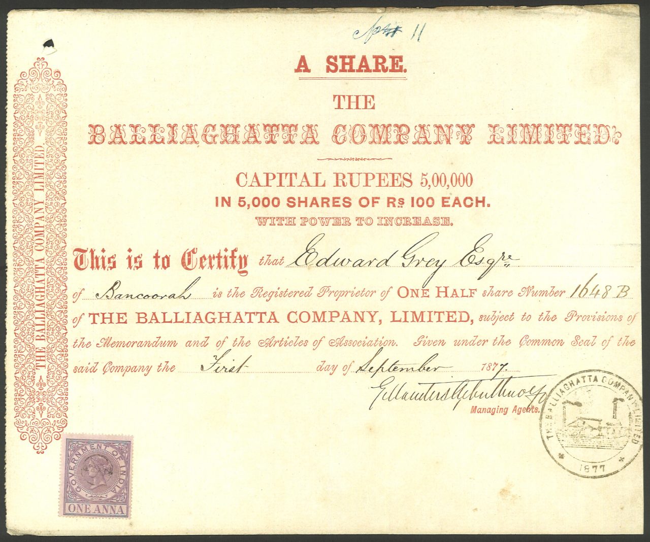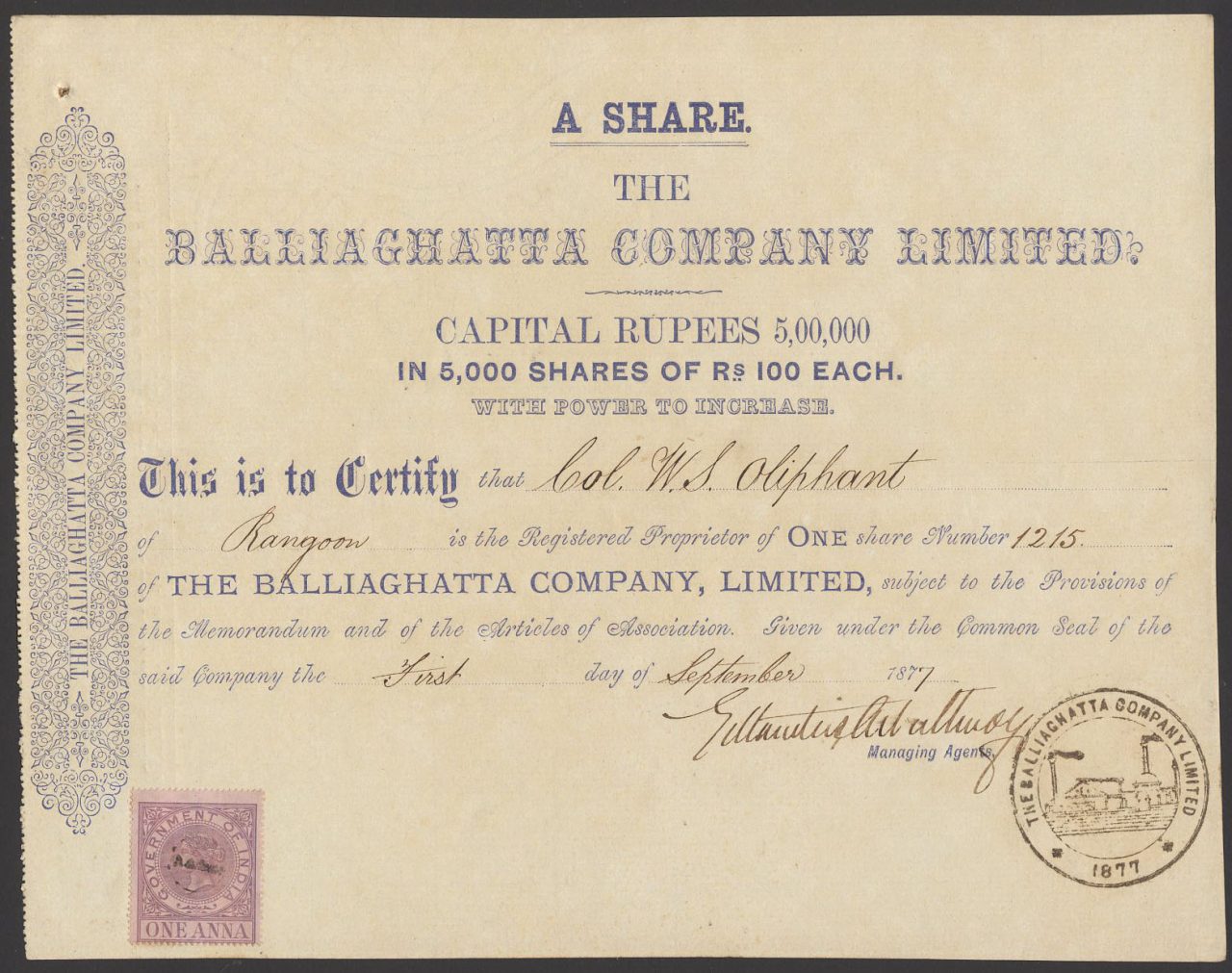 Capitale 5.000.000 di rupie in azioni di 100 rupie.