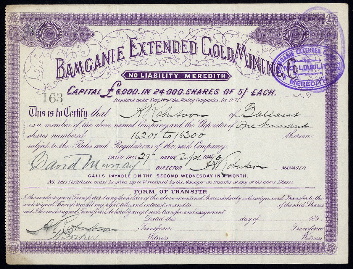 Registrato a Victoria ai sensi del Mining Companies Act del 1871. Miniere a Meredith.