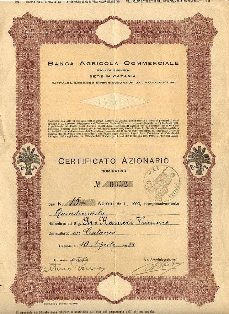 Marchio BAC nel timbro a secco. L’istituto bancario fu fondato nel 1923 e nel 1930 assorbì il Credito Meridionale.