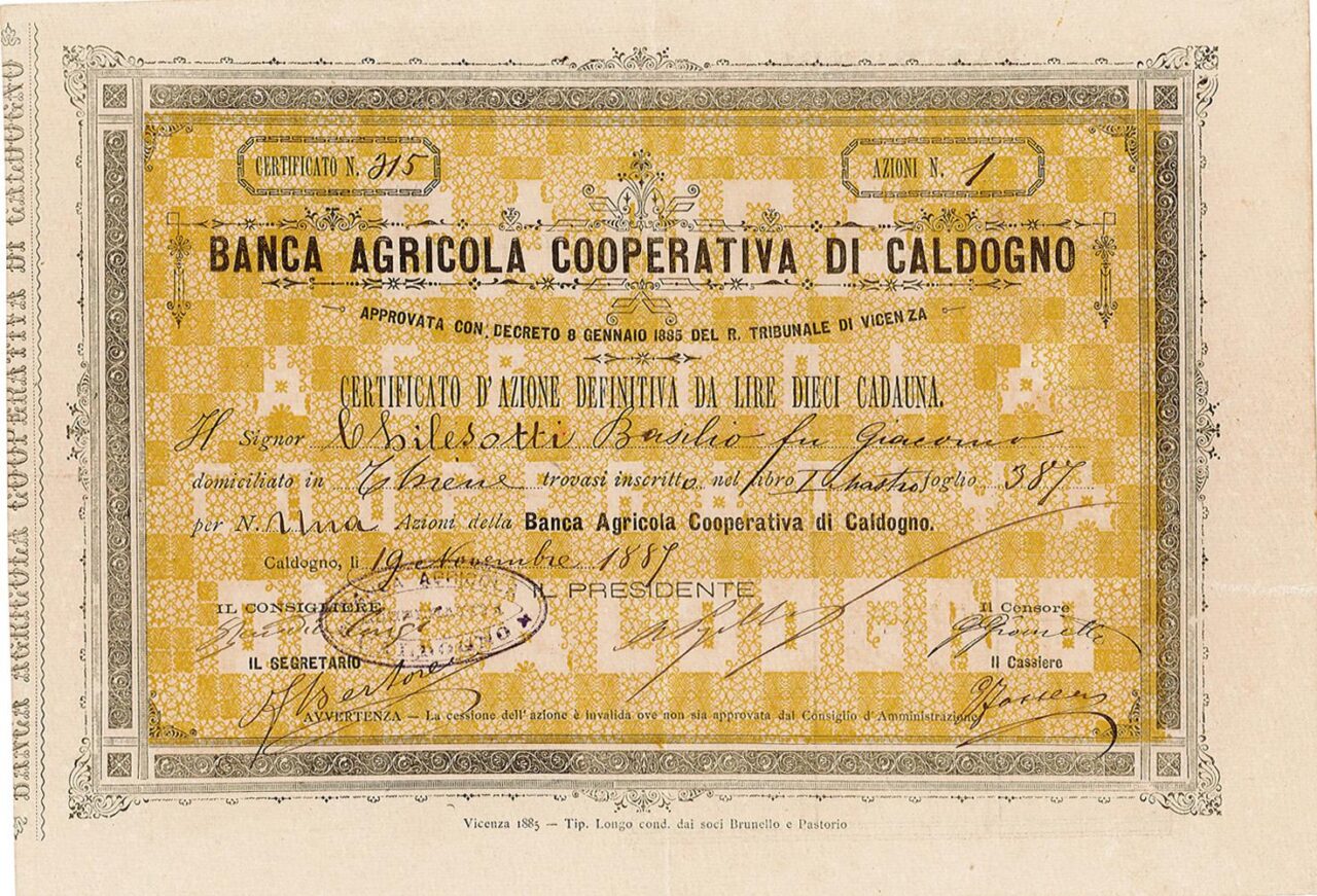 La banca fu fondata nel 1885 per rispondere alle esigenze degli abitanti locali, quasi totalmente occupati nell’agricoltura, quindi per promuovere lo sviluppo delle industrie agricole e per favorire l’esercizio di una latteria sociale. Come avvenne per gli altri istituti cooperativi dell’epoca, fu creata per il “popolo”, ma in realtà era costruita su misura per la piccola borghesia! Successivamente si trasformò in Banca Agricola di Caldogno e, nonostante le molteplici avversità del periodo – fra cui le due guerre mondiali – rimase una viva realtà del paese fino agli anni Cinquanta quando venne incorporata nella Banca Popolare di Vicenza.