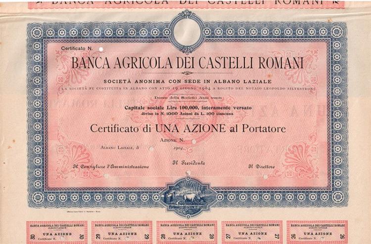 In alto spazio bianco per il logo della società, creata ad Albano Laziale nel 1904. In basso vignetta bucolica ispirata all’aratura con i buoi.