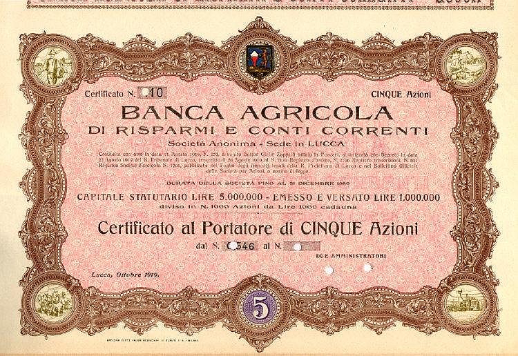 A-34387Banca Agricola di Risparmi e Conti Correnti-1Lucca19195 azioni al portatore da Lire 1.000R2 (1001-5000 pezzi)S2 (da 26 a 50 €)