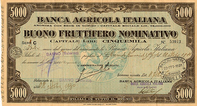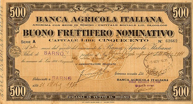 La banca fu fondata a Torino nel 1920 con filiali in tutto il Regno. Sullo sfondo e a tergo medaglione con una giovane e bella spigolatrice con un fascio di spighe.