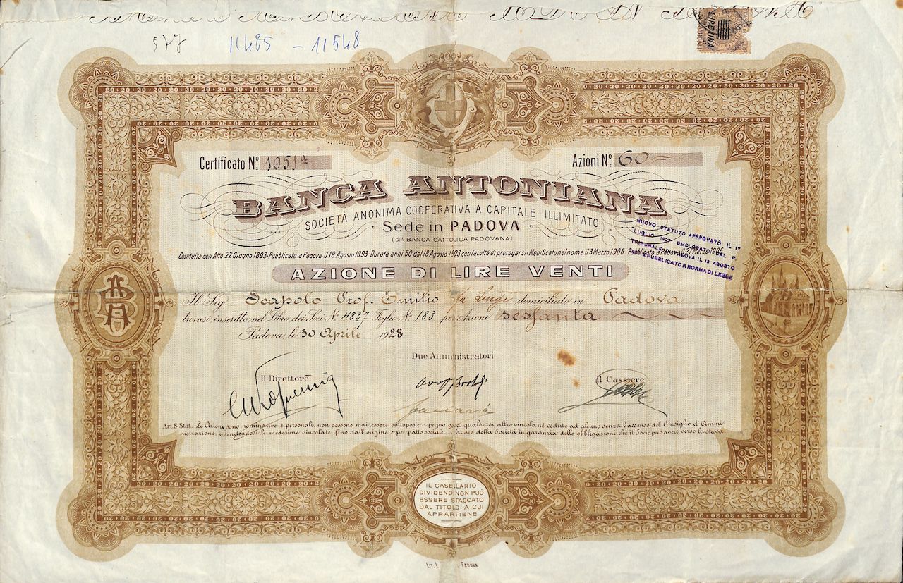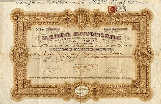 Nel bordo decorativo stemma araldico di Padova, logo dell'istituto bancario e Basilica di Sant'Antonio. La società anonima cooperativa a capitale illimitato fu costituita nel 1893 come Banca Cattolica Padovana. Operando nel mondo contadino ed artigiano, agì fin dall'inizio secondo il criterio del dare "poco a tanti e tanto a nessuno". Secondo il primo statuto solo i soci potevano ricorrere ai benefici del credito erogato, limitatamente al territorio di appartenenza: Provincia e Diocesi di Padova. Nel 1906 mutò ragione sociale in Banca Antoniana. Dopo aver incorporato nel 1970 la Banca Popolare Giuliana di Trieste, assunse la denominazione di Banca Antoniana di Padova e Trieste. Nel 1987 cedette alla Barclays Bank le agenzie di Bologna e di Milano e nel 1989 ... Altro