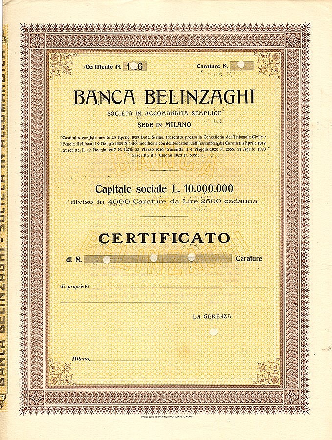 Fu fondata nel 1909 dal banchiere Giulio Belinzaghi (1818-1892), mitico sindaco di Milano rimasto in carica per quasi 19 anni. Nel 1983 fu acquisita dalla Banca Agricola Commerciale di Reggio Emilia che, in tale occasione, mutò denominazione in Credito Emiliano – Credem.