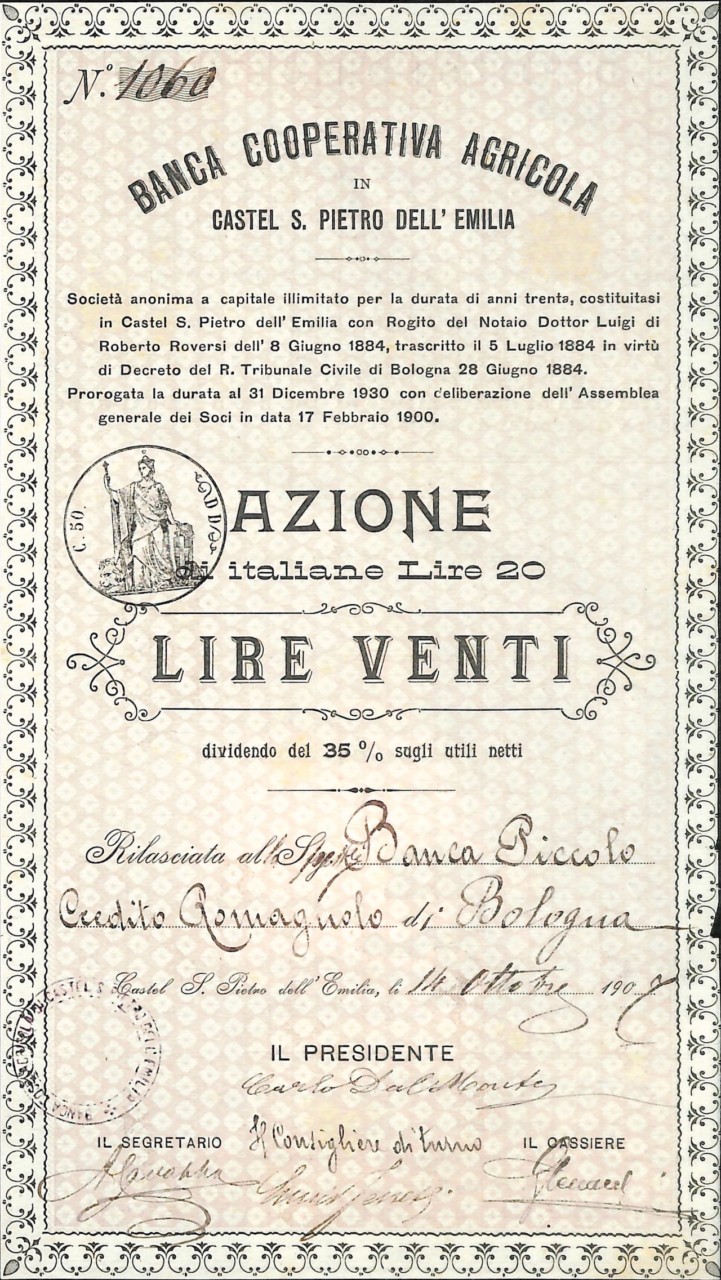 A-6732Banca Coop. Agricola in Castel S. Pietro dell’Emilia-1N.D.Bologna19071 azioneR4 (251-500 pezzi)S4 (da 101 a 250 €)