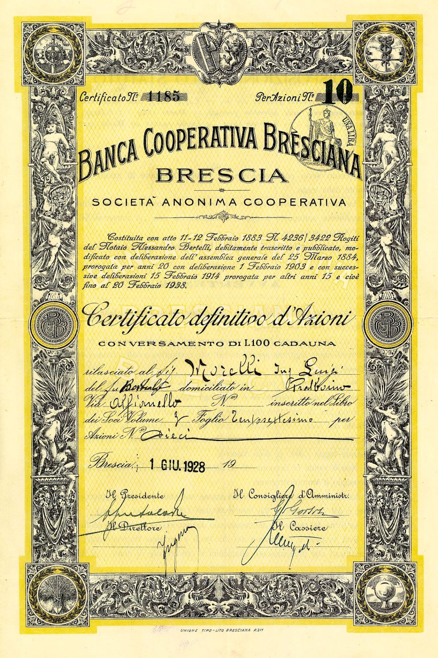 L’emissione del titolo della Banca Cooperativa Bresciana si colloca in un periodo di forte trasformazione economica in Italia. Nata con l’obiettivo di offrire credito agevolato ai piccoli lavoratori e imprenditori, la banca prosperò negli anni Venti, seguendo un modello cooperativo. Tuttavia, la crisi del 1929 e il fallimento di istituti bancari italiani causarono un’ondata di panico finanziario che ebbe conseguenze anche sulla stabilità della Banca Cooperativa Bresciana.