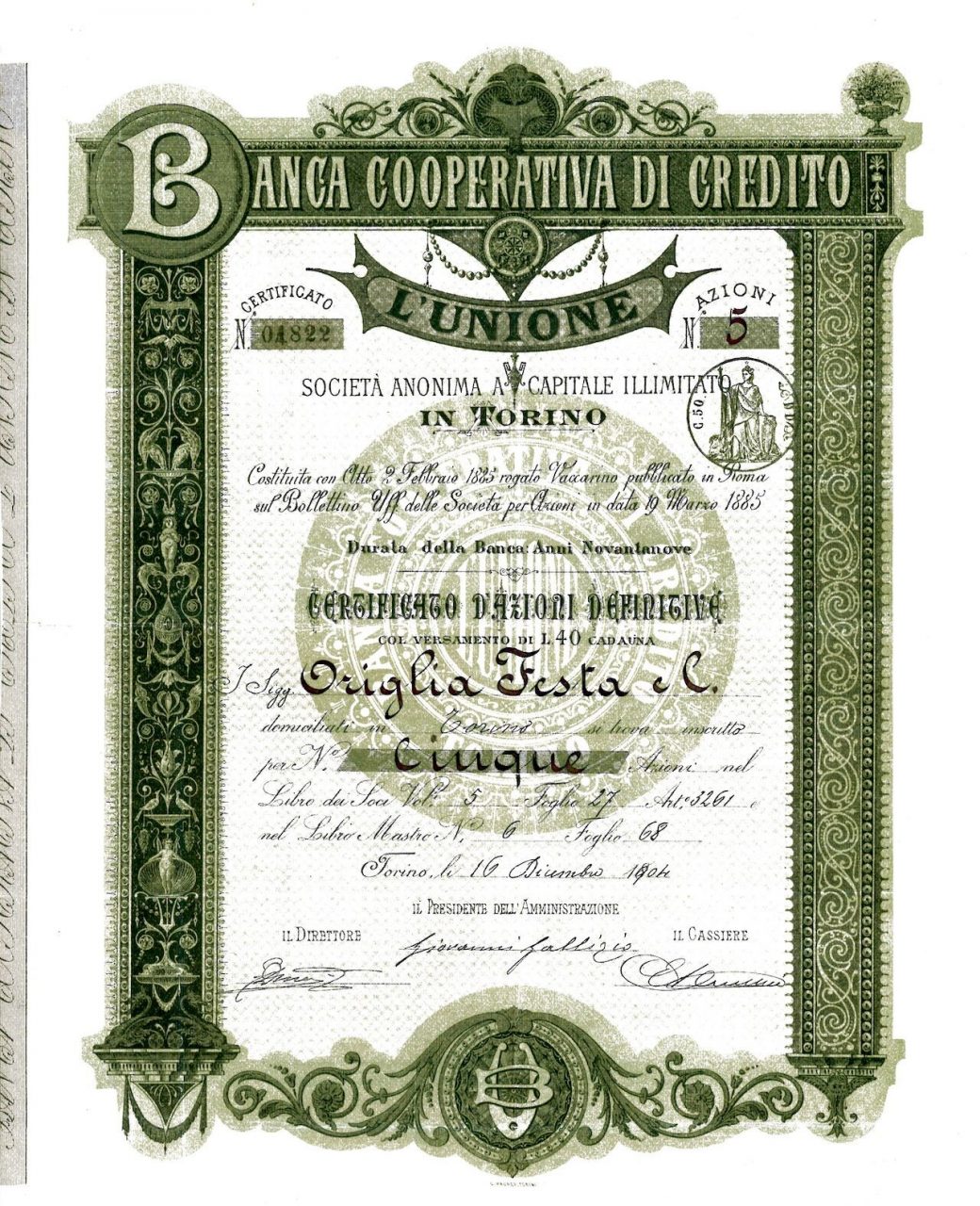 Emesso a Torino il 16 Dicembre 1904 da 5 azioni da Lire 40 cadauna. L'Istituto bancario, di matrice cattolica, nacque a Torino nel 1885. Principale promotore ne fu il conte Francesco Cavagnolo, già direttore di una società di assicurazione chiamata La Benefica e membro dell'Unione Operaia Cattolica di Torino, sezione del Carmine. Dall'articolo 2 dello statuto si evince che lo scopo della banca era quello di procacciare il credito ai suoi soci e particolarmente agli operai, artisti, piccoli industriali e commercianti, per favorirne i materiali interessi con mezzo della mutualità e del risparmio. Si trattò della prima fra le istituzioni economiche sorte a Torino per iniziativa delle Società Cattoliche.