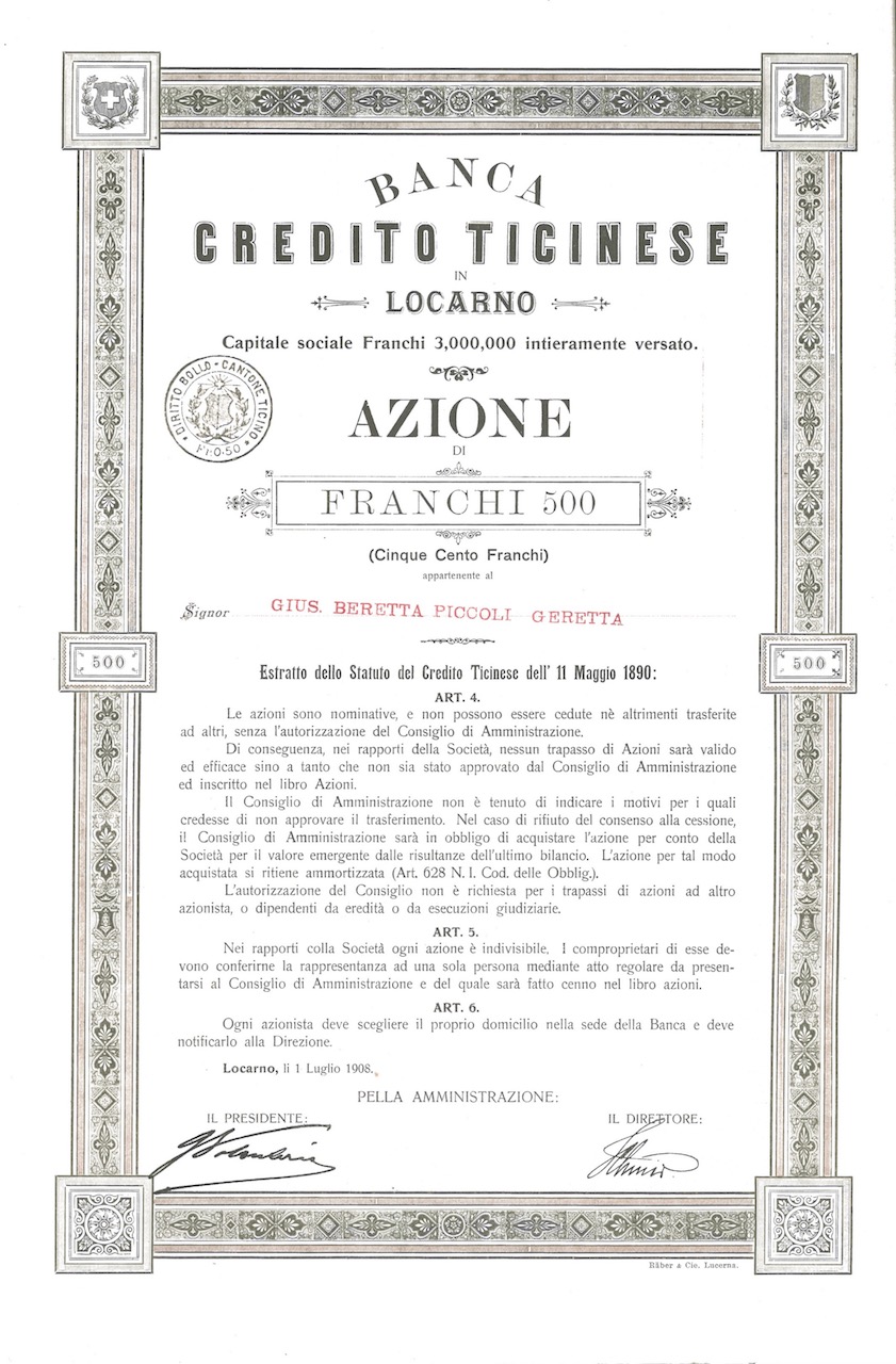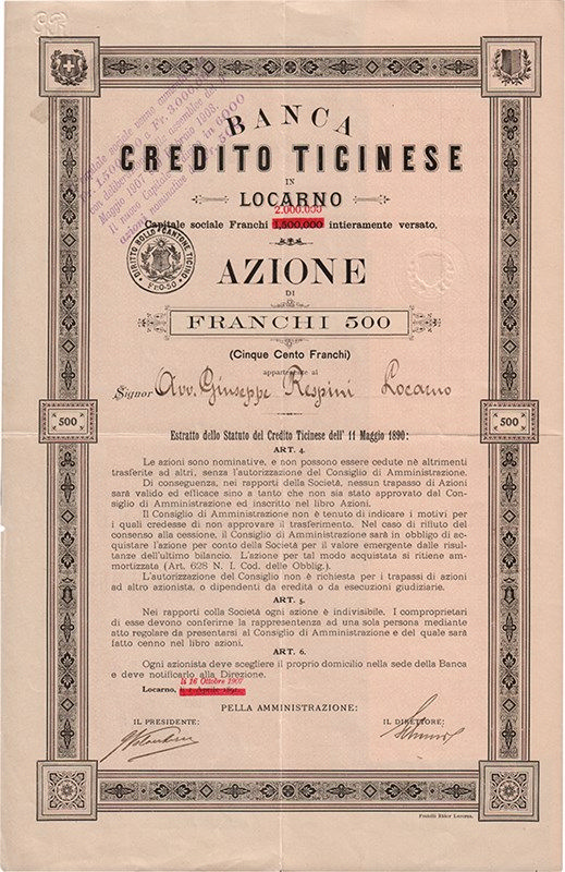 Elegante profilatura stilizzata con stemmi del Ticino e della Svizzera agli angoli superiori. L’istituto bancario fu fondato nel 1891 dal noto avvocato ticinese Gioacchino Respini (1836-1899), capo del partito clericale.