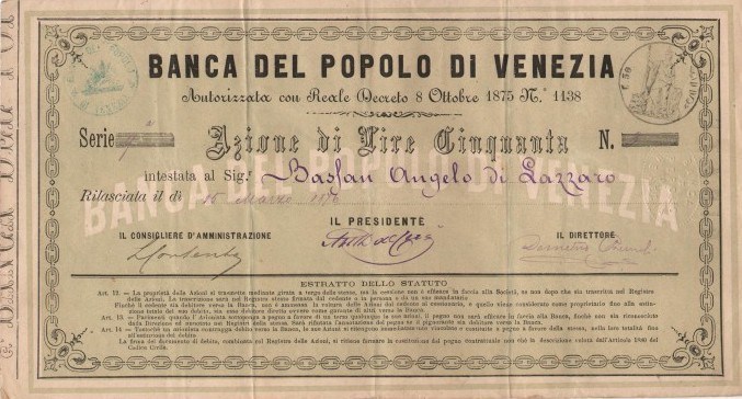 A-30170Banca del Popolo di Venezia-1Venezia18751 Azione R3 (501-1000 pezzi)S5 (da 251 a 500 €)