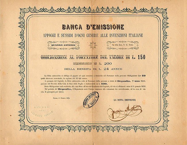 Banca d’Emissione Appoggi e Sussidi d’ogni Genere alle Invenzioni Italiane