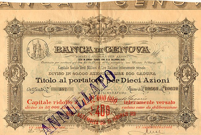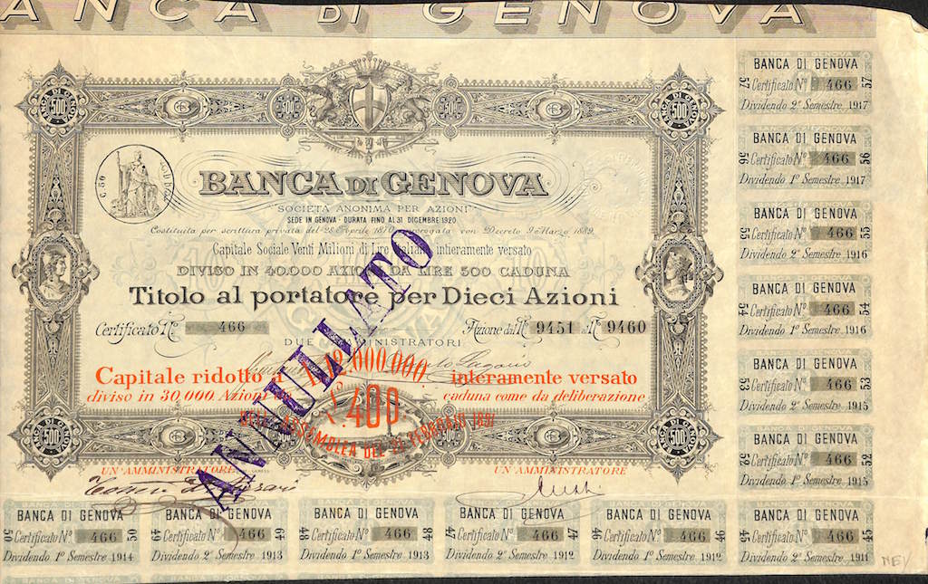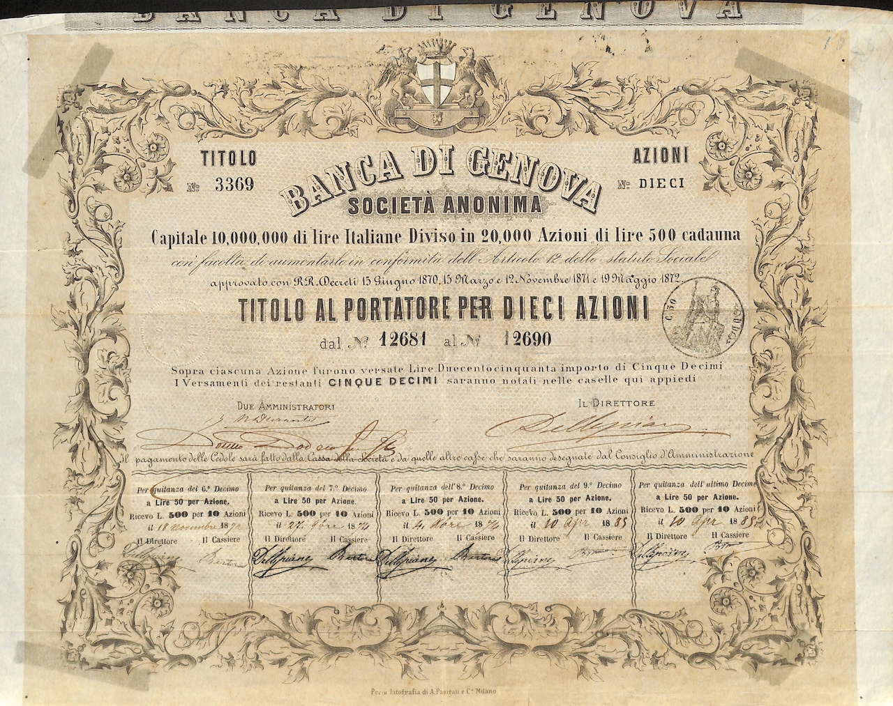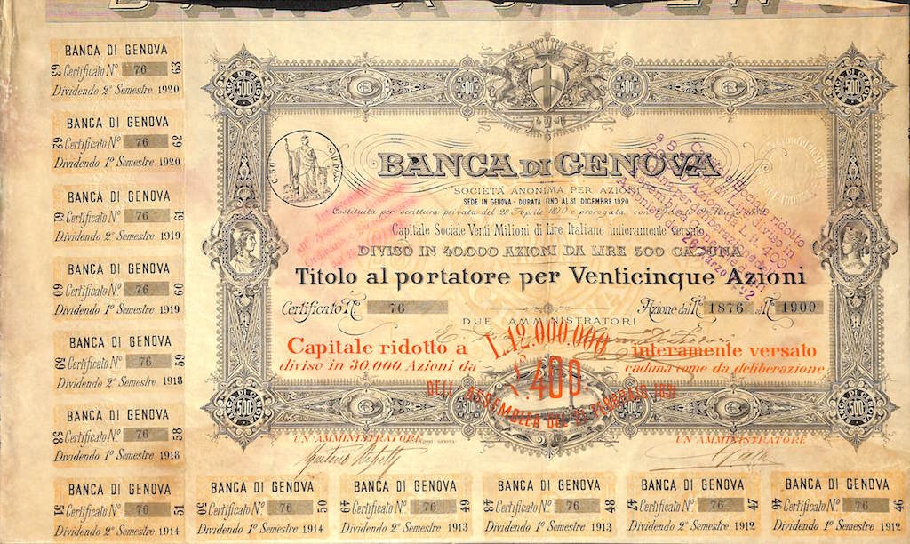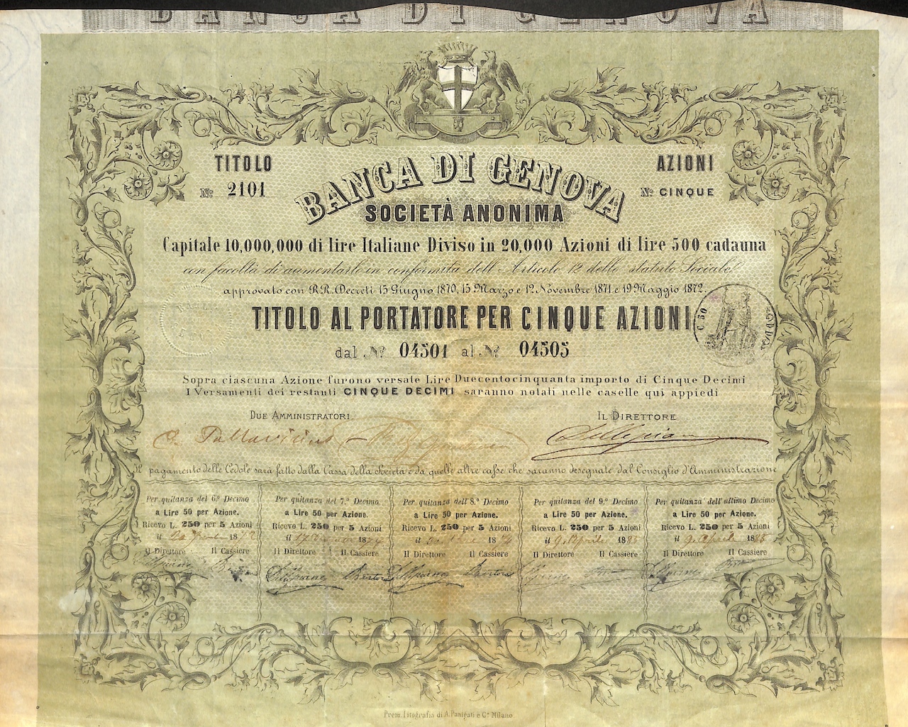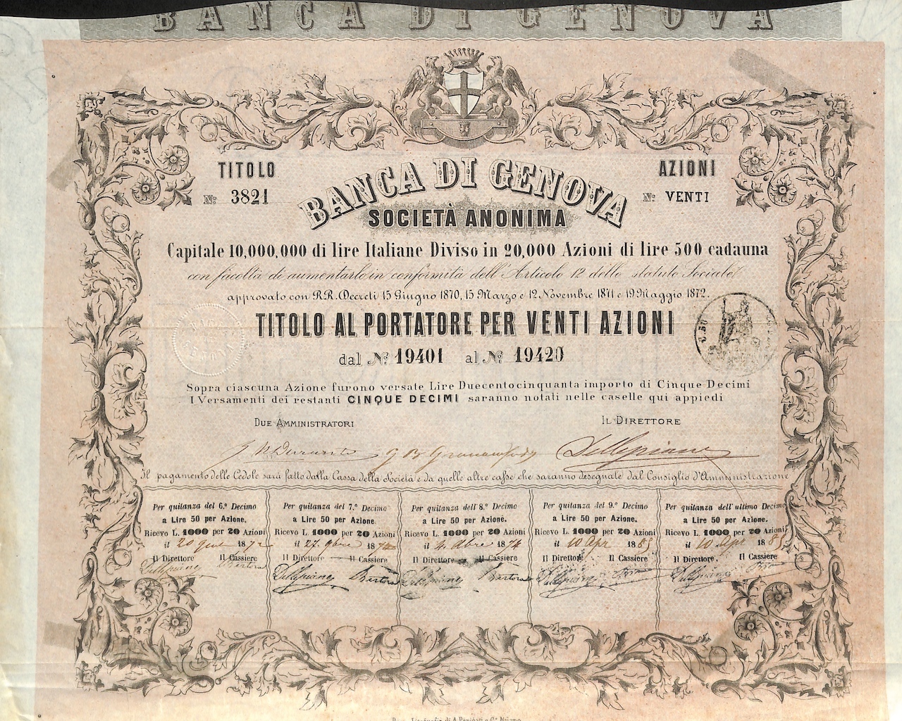 Negli anni della Restaurazione a Genova operavano alcuni banchieri privati, il principale dei quale era Bartolomeo Parodi. Inizialmente contrari alla costituzione di una grande banca in forma di società per azioni, nel 1846 si convinsero che non era più possibile impedire questa evoluzione e perciò nove banchieri privati, capitanati da Parodi, decisero di costituire la Banca di Genova. Presidente ne era Parodi e direttore Carlo Bombrini. Poiché all'epoca la costituzione di una società di capitali richiedeva una specifica autorizzazione governativa, la banca fu costituita con Regie patenti del 16 marzo 1846. Il capitale sociale era di quattro milioni di lire sarde. Oltre alle quote dei nove banchieri fondatori, una parte consistente del capitale, per 2.600.00... Altro