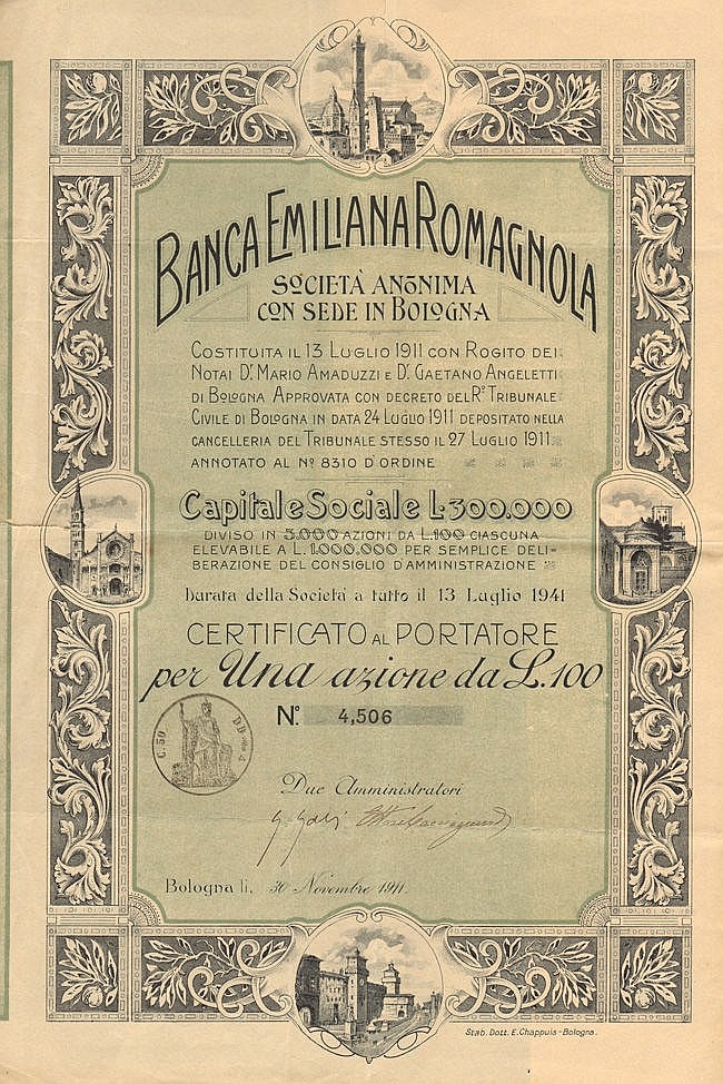 Bei fregi nel bordo, pittoreschi scorci del capoluogo emiliano con vedute di celebri palazzi, chiese e le due torri, simbolo della città. Emissione originaria di 3.000 azioni.