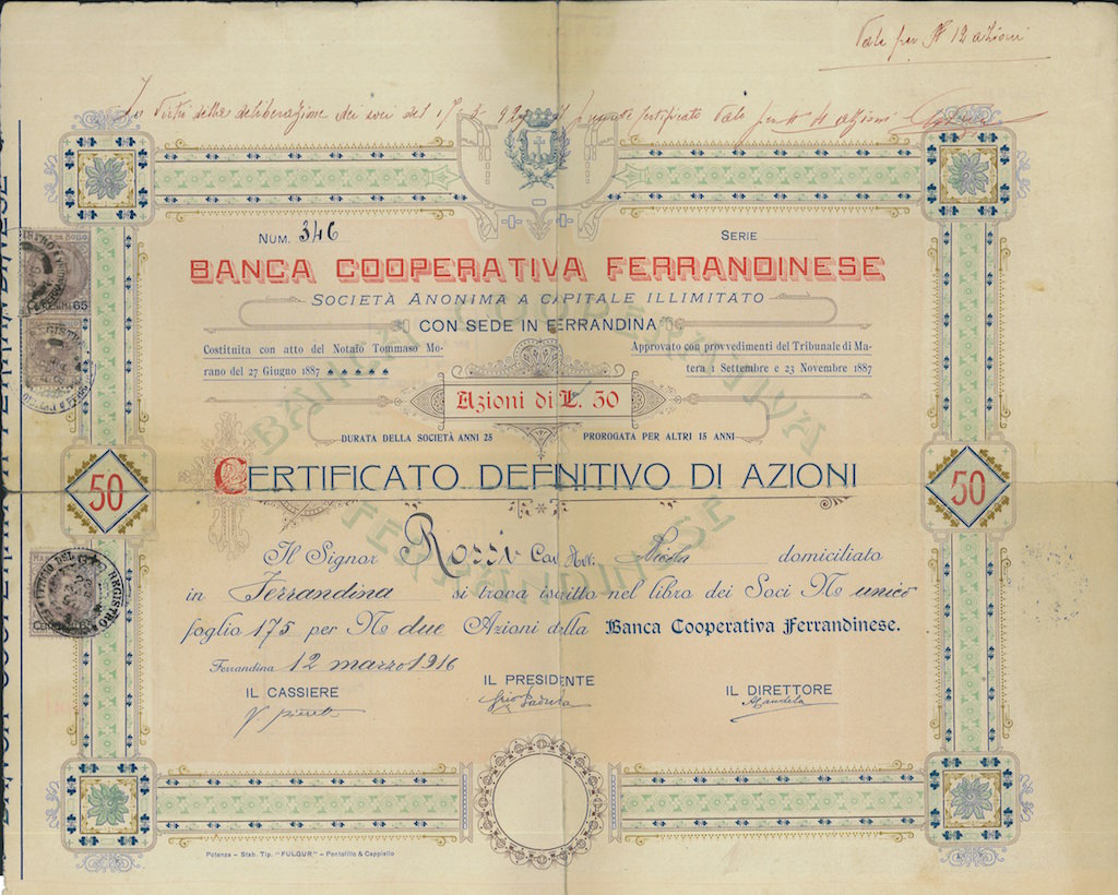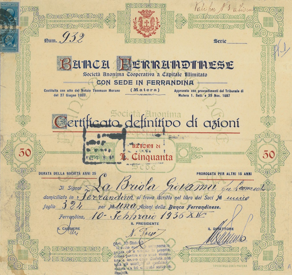 C-3075--Matera1934Azione nominativa da Lire 50R2 (1001-5000 pezzi)S2 (da 26 a 50 €)