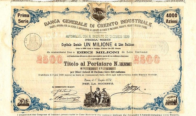 B-35262Banca Generale di Credito Industriale per lo Sconto e Anticipazioni su Depositi di Fondi di Magazzino, Derrate, Merci e Oggetti d’Arte-2Roma187210 azioni di fondazione al portatore da Lire 250R3 (501-1000 pezzi)S5 (da 251 a 500 €)