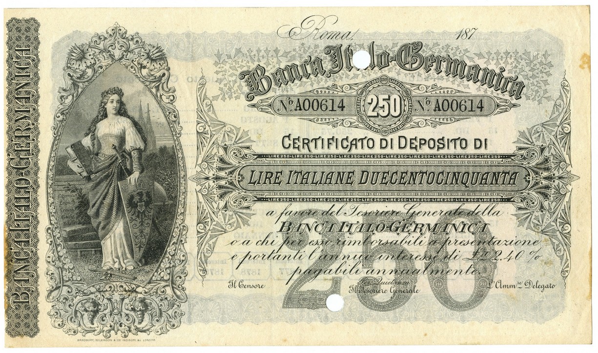 Banca emittente creata con capitali tedeschi nel 1871 dal finanziere ebreo Giovanni Servadio, che ne fu anche il primo presidente. Perseguiva lo scopo di favorire lo sviluppo del credito fra Italia e Germania. Tuttavia nel 1875, dopo la morte del suo fondatore, andò incontro ad una progressiva decadenza finanziaria e, non riuscendo più a far fronte ai vari impegni assunti, fu posta in liquidazione fallimentare. Disponendo, comunque, di un portafoglio ricco in titoli azionari ed obbligazionari di società ferroviarie nonché di vaste proprietà terriere ed immobiliari, l’istituto venne rilevato dalla Banca Tiberina nel 1877.