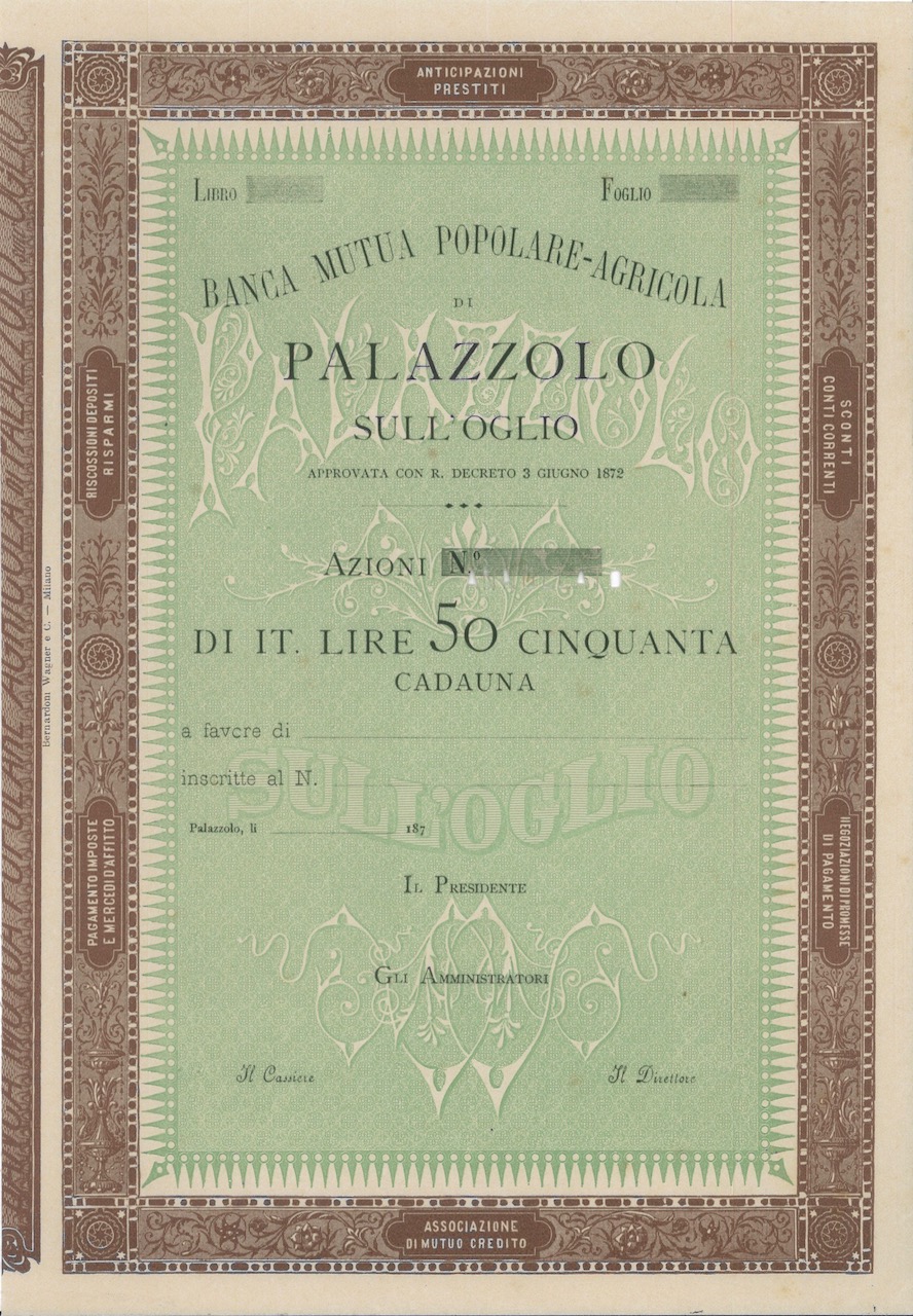 A-9595Banca Mututa Popolare Agricola di Palazzolo sull’Oglio-1Bernardoni Wagner e C. - MilanoBrescia1872VariabileR4 (251-500 pezzi)S4 (da 101 a 250 €)