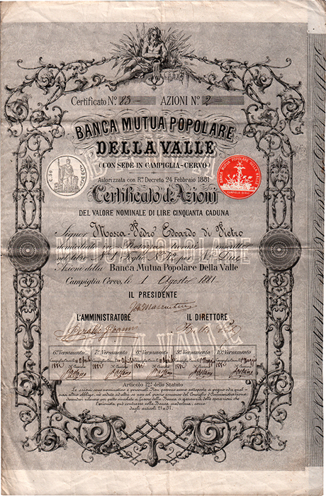 In alto, al centro del bel bordo fregiato, spicca l’immagine di Nettuno che mesce acqua da un’anfora, probabile allusione al torrente Cervo sulle cui rive è disposto il territorio comunae di Campiglia. Timbro a secco, su campo arancio, della banca costituita nel 1881 con una succursale ad Andorno Cacciorna.
