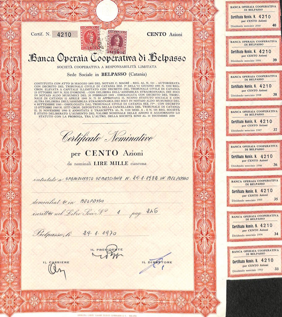 E-6139Banca Operaia Cooperativa di Belpasso-5Officina Carte Valori Turati Lombardi e C. - MilanoCatania1970100 azioniR2 (1001-5000 pezzi)S2 (da 26 a 50 €)