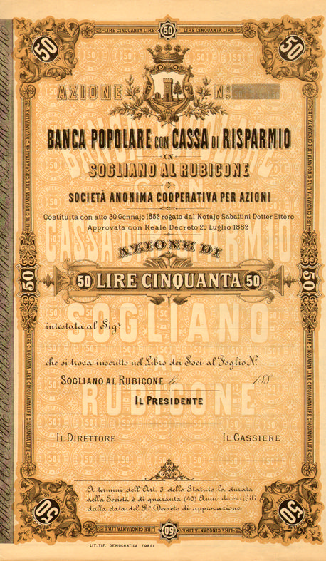 In alto campeggia lo stemma coronato della cittadina romagnola. Lo stesso esemplare é riprodotto nel volume regionale di carte valori d’epoca Emilia Romagna e San Marino.