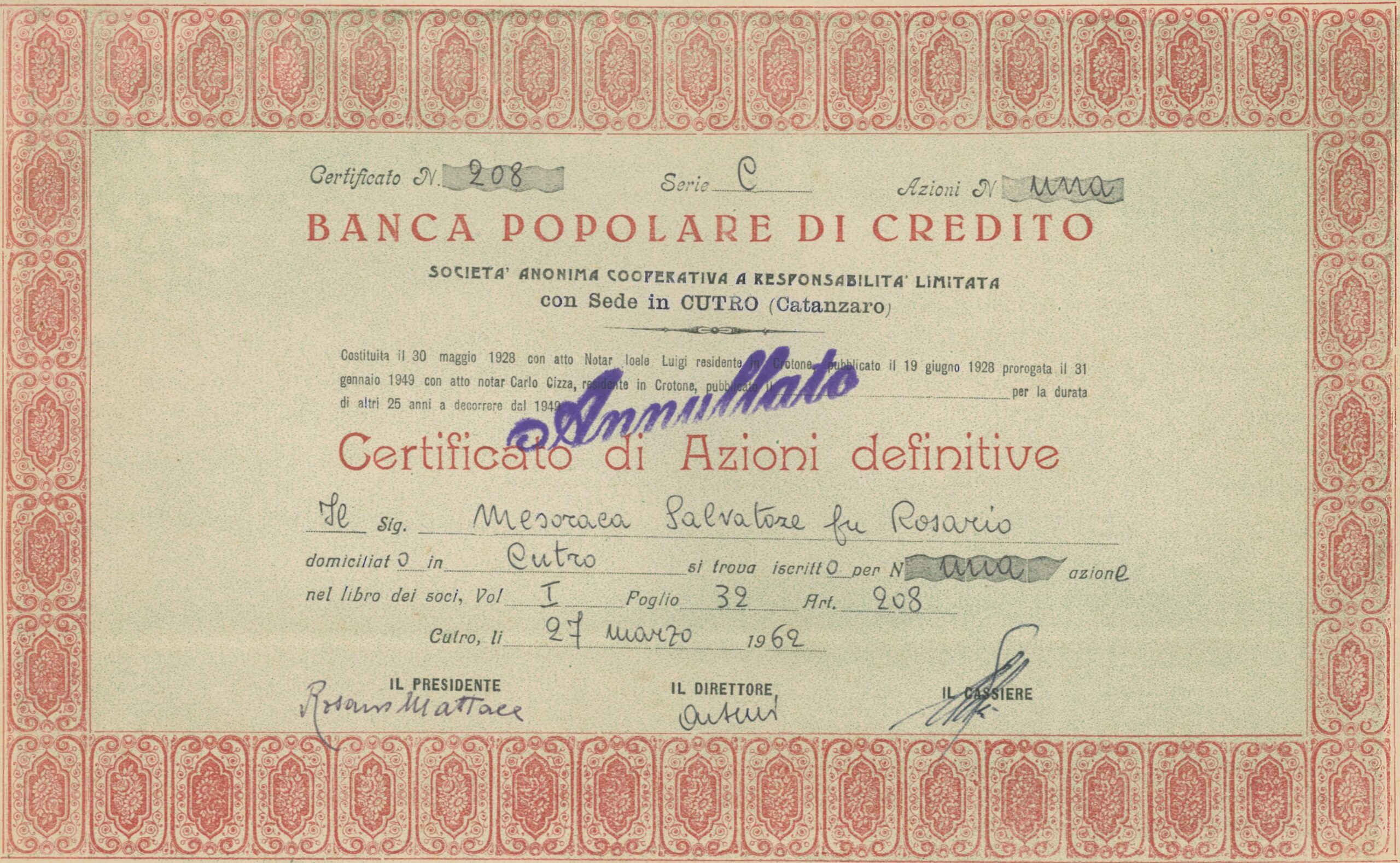 L’istituto bancario fu autorizzato nel 1928 ad esercitare la propria attività in tutta la provincia di Catanzaro.