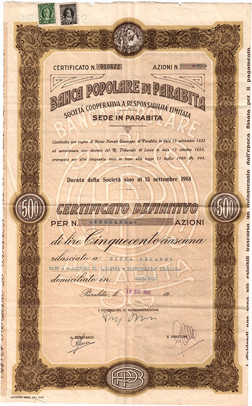 Fondata nel 1888, rappresenta la banca più antica fra quelle che concorsero – mediante vari processi di aggregazione – alla formazione dell’attuale Banca Popolare Pugliese. Era caratterizzata, come tutte le banche popolari, da uno stretto legame con il territorio di appartenenza, rappresentando il motore dello sviluppo economico dell’entroterra salentino, secondo il motto non molto a pochi ma poco a molti. Effige del dio Bacco in alto, logotipi in basso e sullo sfondo.