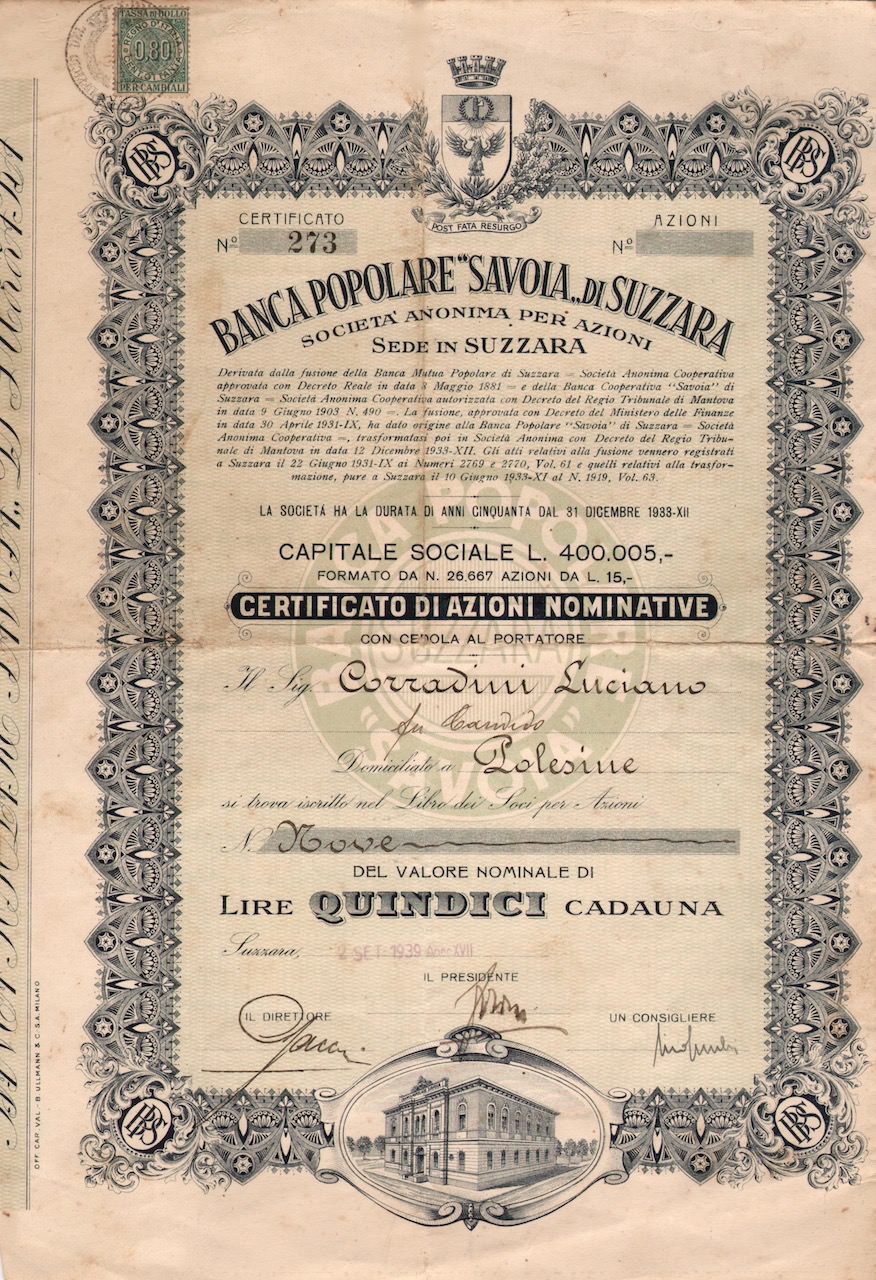B-27060Banca Popolare di Savoia di Suzzara-2B. Ullmann & C. - MilanoMantova1939VariabileR3 (501-1000 pezzi)S3 (da 51 a 100 €)