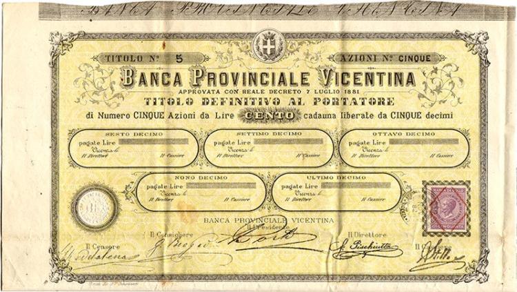 B-37308Banca Provinciale Vicentina-2Vicenza18825 azioni al portatore da Lire 100R3 (501-1000 pezzi)S4 (da 101 a 250 €)