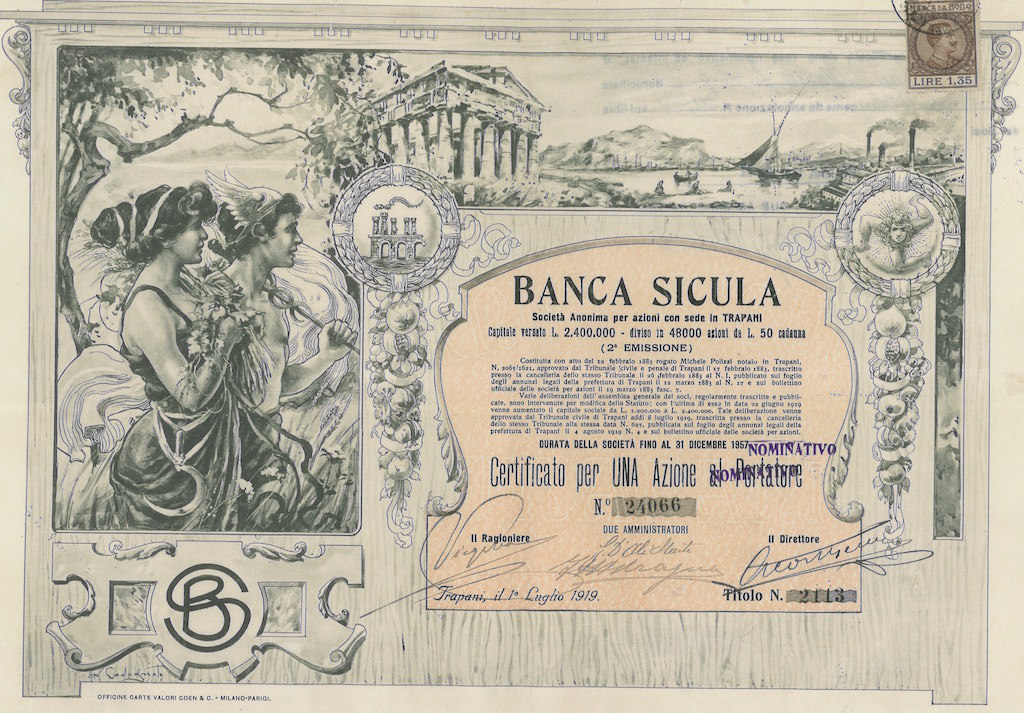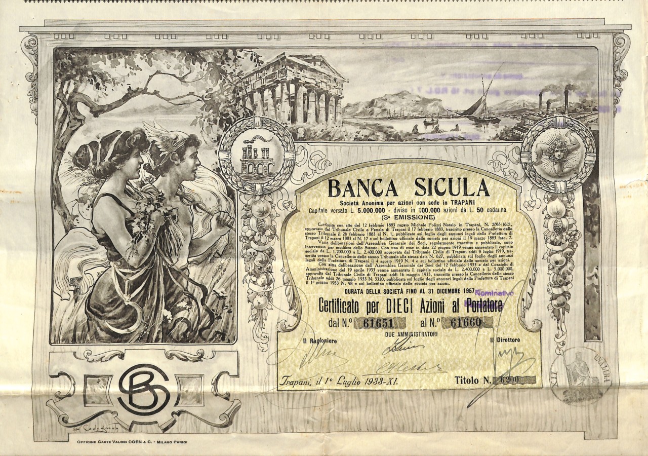 E-642Banca Sicula-5Officina Carte Valori Coen & C. Milano - ParigiTrapani193310 azioni (Illustratore Codognato)R6 (51-100 pezzi)S6 (da 501 a 1.000 €)