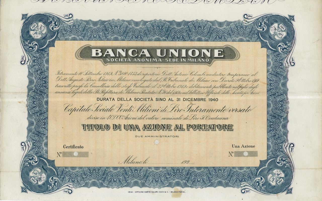 B-1036Banca Unione-2Calcografia & Cartevalori - MilanoMilano191950 azioniR3 (501-1000 pezzi)S2 (da 26 a 50 €)