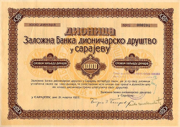 A-55787Banca Unione di Sarajevo-1Sarajevo19221 azione al portatore da 1.000 Dinari--