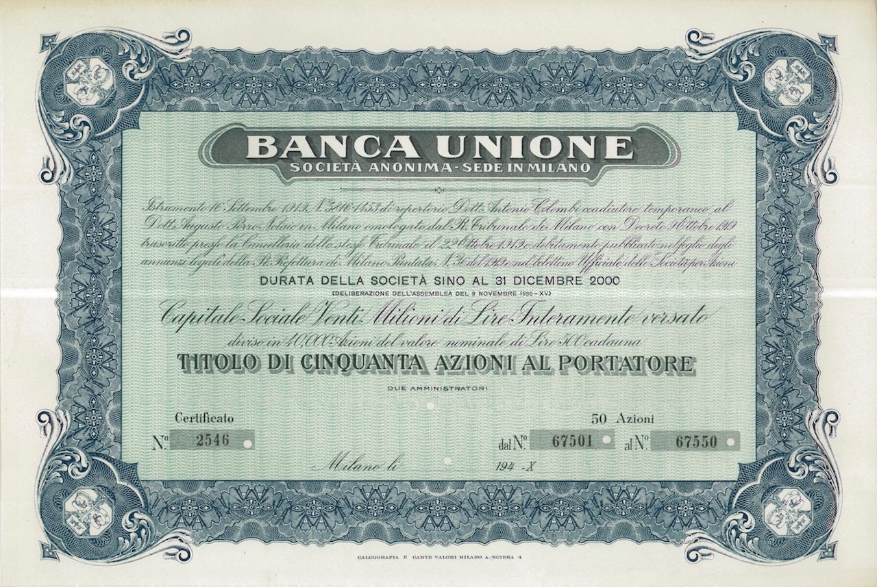 B-1036Banca Unione-2Calcografia & Cartevalori - MilanoMilano191950 azioniR3 (501-1000 pezzi)S2 (da 26 a 50 €)