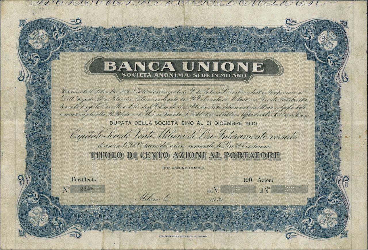 D-1036Banca Unione-4Officina Carte Valori Coen & C. Milano - ParigiMilano1930100 azioniR3 (501-1000 pezzi)S2 (da 26 a 50 €)