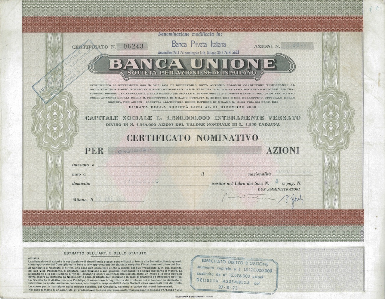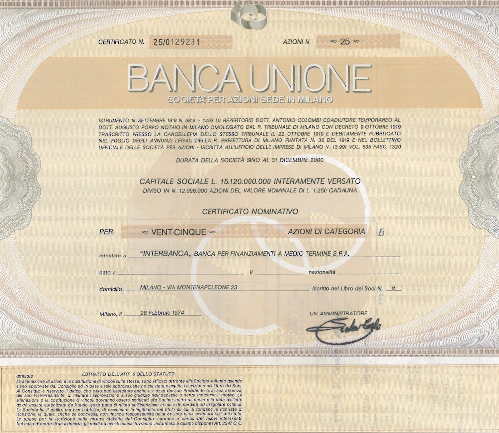 I-1036Banca Unione-9Grafiche Gelmini - MilanoMilano197425 azioniR1 (Più di 5000 pezzi)S1 (da 0 a 25 €)
