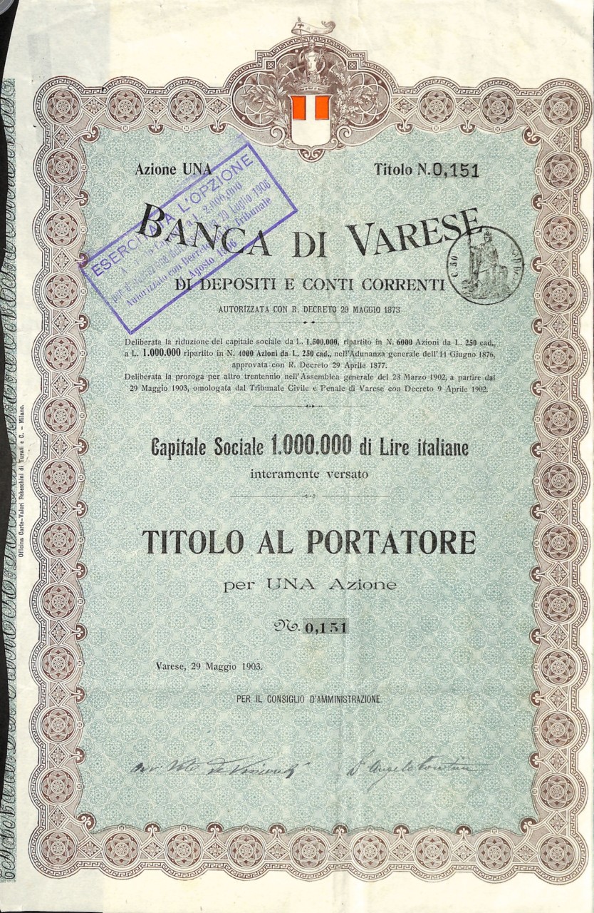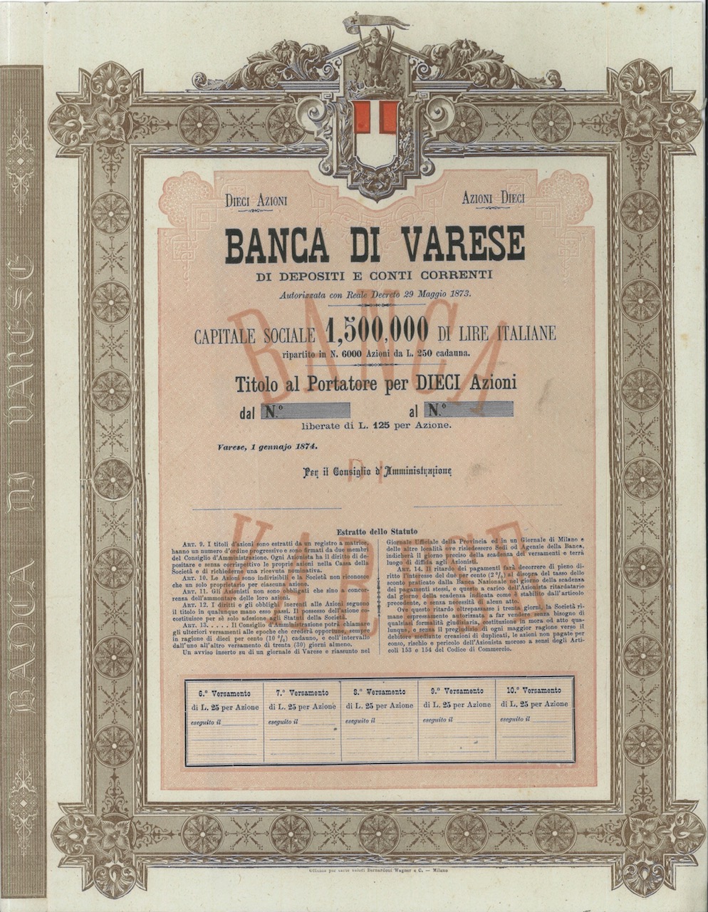 A-6713Banca di Varese di Depositi e Conti Correnti-1Bernardoni Wagner e C. - MilanoVarese187410 azioniR6 (51-100 pezzi)S5 (da 251 a 500 €)