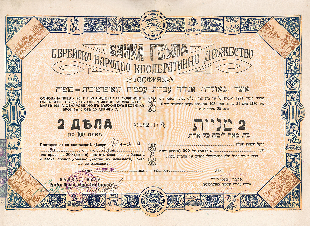 La Banca Sionista, fondata a Sofia nel 1921, è esistita fino al 1951. La Banca Geula (Geula in ebraico = redenzione) aveva più di 30.000 membri in Bulgaria, ha raggiunto un potere finanziario sorprendentemente grande, ha finanziato alcuni progetti di insediamento in Palestina. Gli ebrei risiedevano in Bulgaria fin dall’epoca romana. Dopo che la Bulgaria divenne parte dell’Impero Ottomano (1396), molti ebrei si stabilirono qui in fuga dall’Inquisizione. Nel 1880 furono fondati i primi gruppi sionisti in Bulgaria, dal 1894 acquisto di terra in Palestina (Har Tuv) e primo insediamento. Nonostante le leggi razziali modellate sulle leggi di Norimberga, l’opposizione parlamentare bulgara, sostenuta dalla Chiesa ortodossa, impedì la deportazione e lo sterminio dei sionisti. La Chiesa ha impedito la deportazione e lo sterminio degli ebrei bulgari. 1944 Abrogazione delle leggi antiebraiche. Bilingue bulgaro/ebraico, interessante veste grafica con illustrazioni simboliche delle dodici tribù di Israele, inoltre quattro vignette di paesaggi della Palestina, stelle di Davide, decorazioni floreali, motivi Art Nouveau.