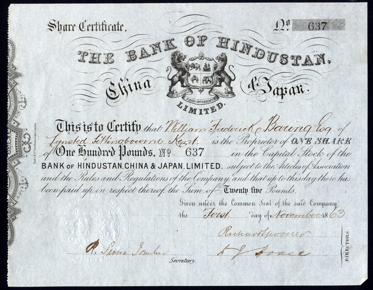 Registrato nel 1862, £ 25 delle azioni £ 100 pagate. Nel 1864 il capitale sottoscritto di "Nuove azioni" era aumentato di £ 2.000.000 nello stesso anno a £ 4.000.000. Fallito nella crisi del 1866. Numero di società 2759.