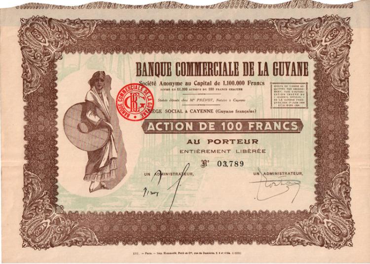 La banca fu creata proprio nel periodo di massimo splendore per la Guiana, all’epoca colonia francese in Sud America, dove si andava sviluppando l’industria mineraria aurifera. Elegante dama in abiti coloniali, scorcio della foresta pluviale amazzonica sullo sfondo, una vera miniera per i cercatori d’oro francesi e indigeni.