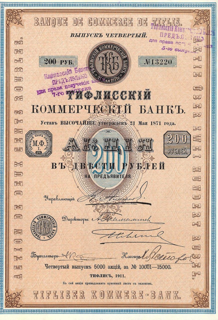 Fondazione il 21 maggio 1871. Titolo bancario dalla capitale di quella che oggi è la Repubblica del Caucaso della Georgia.