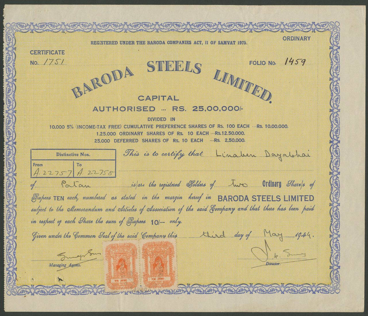 A-37521Baroda Steels Limited-1Princely States1944ordinary sharesR1 (Più di 5000 pezzi)S1 (da 0 a 25 €)
