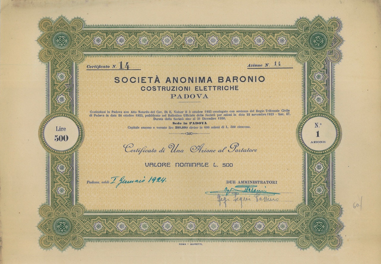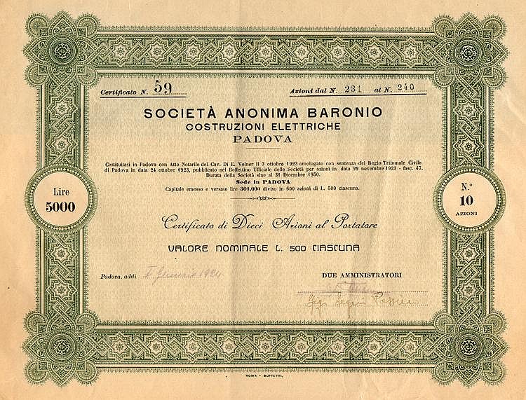 A-13881Baronio Soc. An. – Costruz. Elettriche-1Registri BuffettiPadova19241 azioneR3 (501-1000 pezzi)S3 (da 51 a 100 €)